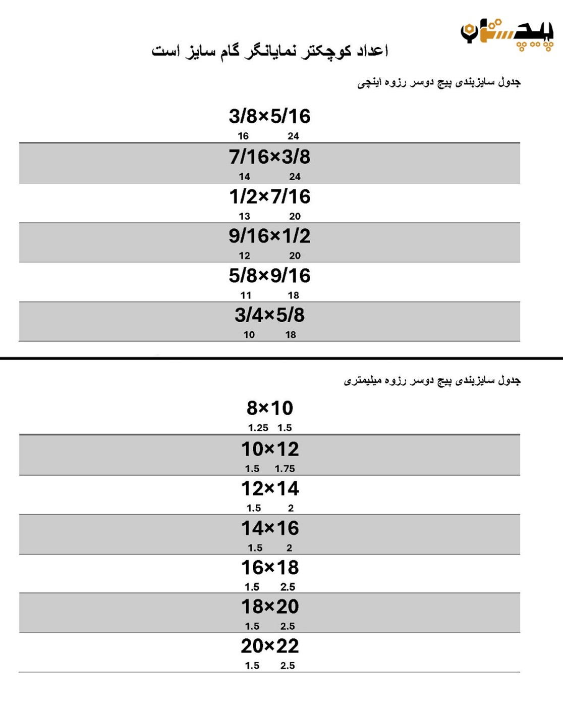 جدول سایزبندی پیچ دو سررزوه تبدیلی